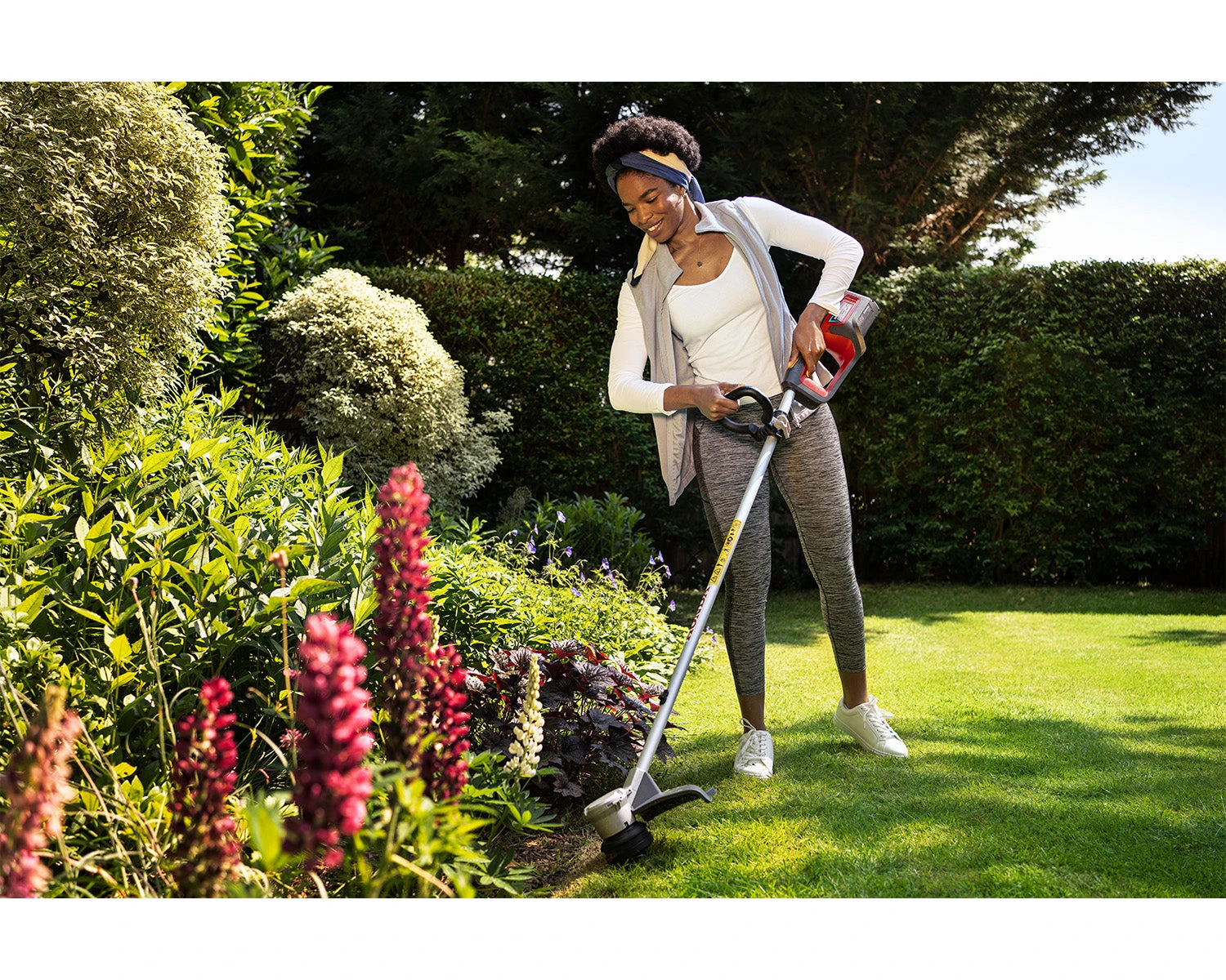 The trimmer features a fully adjustable loop handle to optimise balance, and a variable speed trigger which allows users to adjust the speed dependent on the task. The trimmer also features a folding plant protector to shield plants and flowers while trimming.